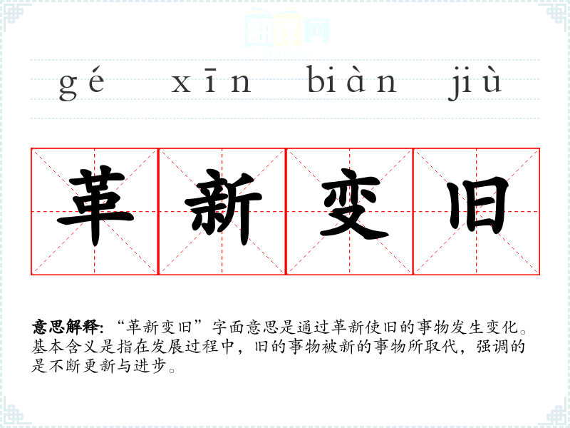“革新变旧”字面意思是通过革新使旧的事物发生变化。基本含义是指在发展过程中,旧的事物被新的事物所取代,强调的是不断更新与进步。