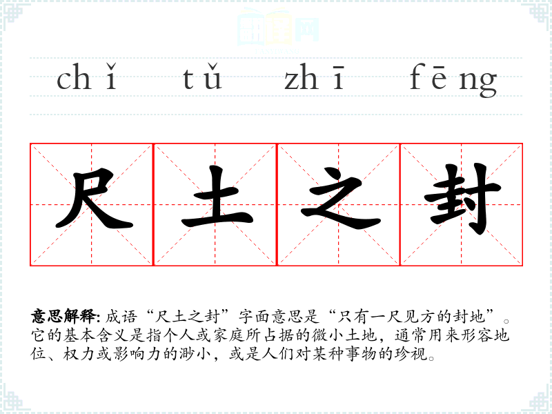 成语“尺土之封”字面意思是“只有一尺见方的封地”。它的基本含义是指个人或家庭所占据的微小土地,通常用来形容地位、权力或影响力的渺小,或是人们对某种事物的珍视。