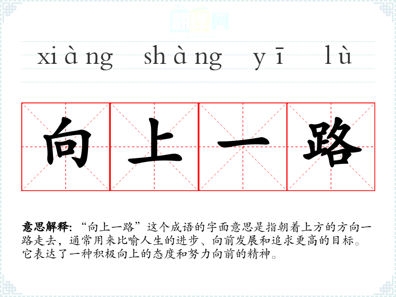 “向上一路”这个成语的字面意思是指朝着上方的方向一路走去,通常用来比喻人生的进步、向前发展和追求更高的目标。它表达了一种积极向上的态度和努力向前的精神。