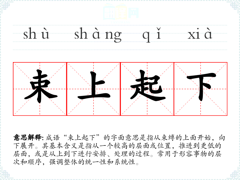 “束上起下”给人一种整齐、清晰的感觉,能够引发对高效管理和有序生活的向往。它让人联想到一种掌控感,特别是在面对复杂问题时,能够理清思路,逐步解决问题的能力。