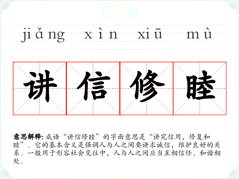 成语“讲信修睦”的字面意思是“讲究信用,修复和睦”。它的基本含义是强调人与人之间要讲求诚信,维护良好的关系。一般用于形容社会交往中,人与人之间应当互相信任、和谐相处。