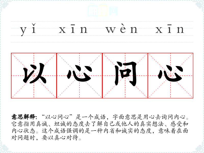 “以心问心”是一个成语,字面意思是用心去询问内心。它意指用真诚、坦诚的态度去了解自己或他人的真实想法、感受和内心状态。这个成语强调的是一种内省和诚实的态度,意味着在面对问题时,要以真心对待。
