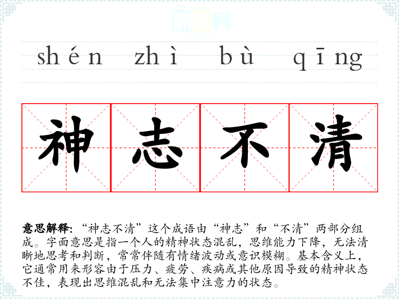“神志不清”这个成语由“神志”和“不清”两部分组成。字面意思是指一个人的精神状态混乱,思维能力下降,无法清晰地思考和判断,常常伴随有情绪波动或意识模糊。基本含义上,它通常用来形容由于压力、疲劳、疾病或其他原因导致的精神状态不佳,表现出思维混乱和无法集中注意力的状态。