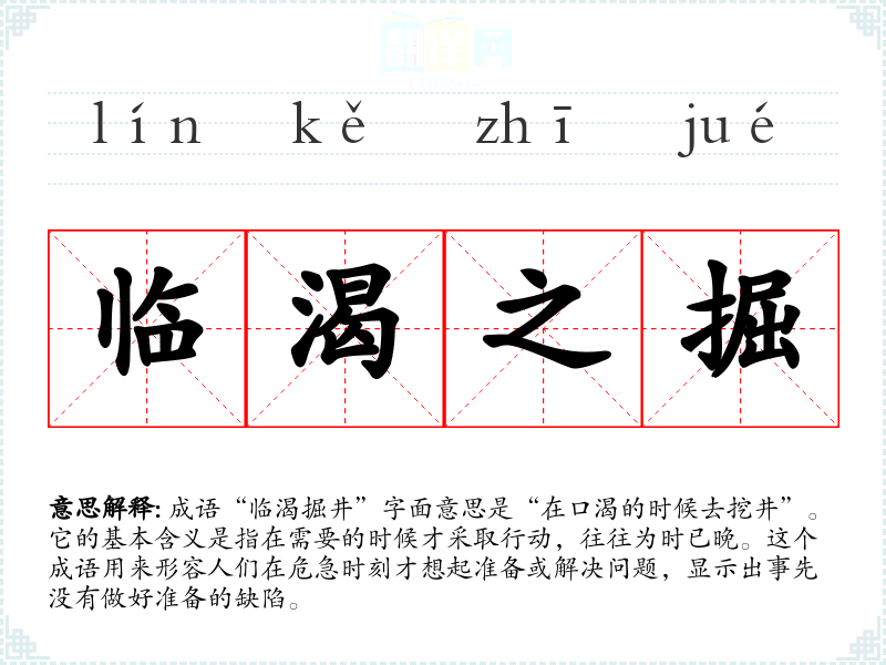 成语“临渴掘井”字面意思是“在口渴的时候去挖井”。它的基本含义是指在需要的时候才采取行动,往往为时已晚。这个成语用来形容人们在危急时刻才想起准备或解决问题,显示出事先没有做好准备的缺陷。