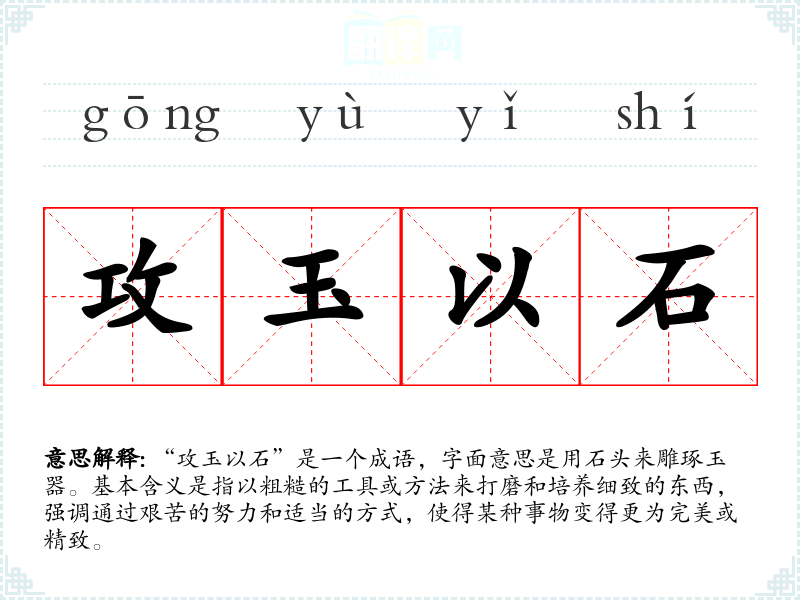 “攻玉以石”是一个成语,字面意思是用石头来雕琢玉器。基本含义是指以粗糙的工具或方法来打磨和培养细致的东西,强调通过艰苦的努力和适当的方式,使得某种事物变得更为完美或精致。