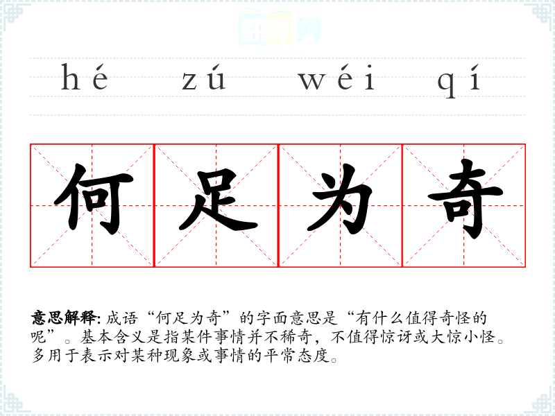 成语“何足为奇”的字面意思是“有什么值得奇怪的呢”。基本含义是指某件事情并不稀奇,不值得惊讶或大惊小怪。多用于表示对某种现象或事情的平常态度。