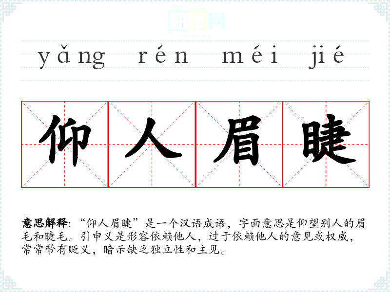 “仰人眉睫”是一个汉语成语,字面意思是仰望别人的眉毛和睫毛。引申义是形容依赖他人,过于依赖他人的意见或权威,常常带有贬义,暗示缺乏独立性和主见。