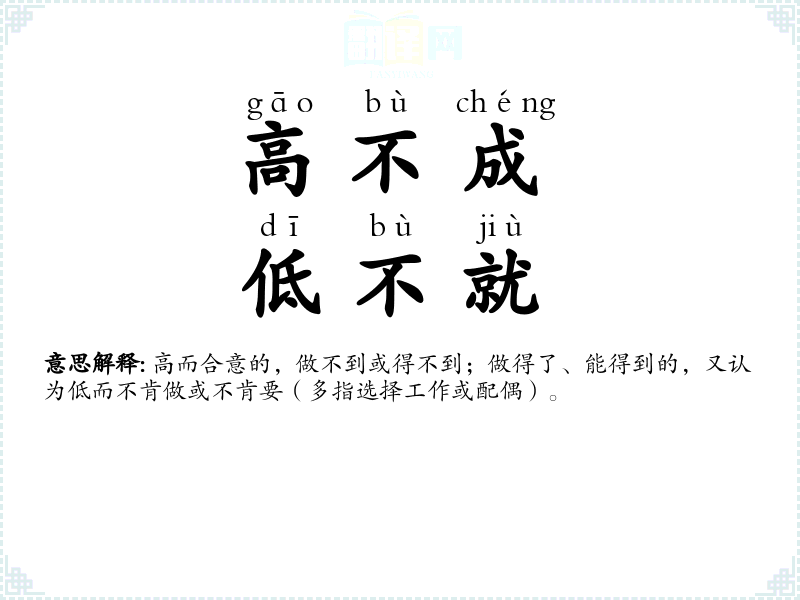 | 高不成,低不就 | 高而合意的,做不到或得不到;做得了、能得到的,又认为低而不肯做或不肯要(多指选择工作或配偶)。 |