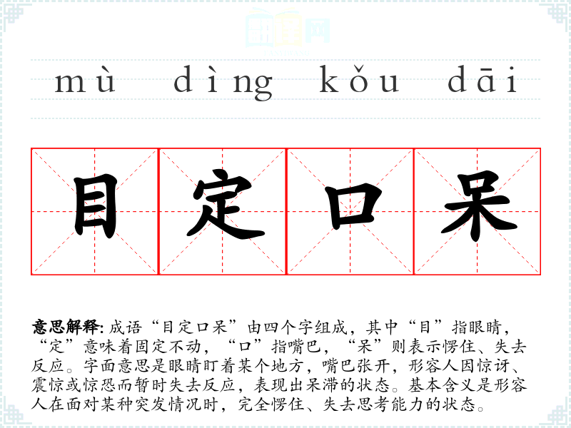 - “目瞪口呆”:与“目定口呆”意义相近,强调因惊讶而无法反应。