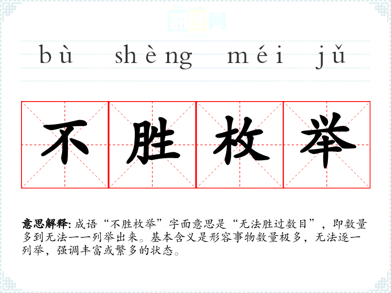 成语“不胜枚举”字面意思是“无法胜过数目”,即数量多到无法一一列举出来。基本含义是形容事物数量极多,无法逐一列举,强调丰富或繁多的状态。