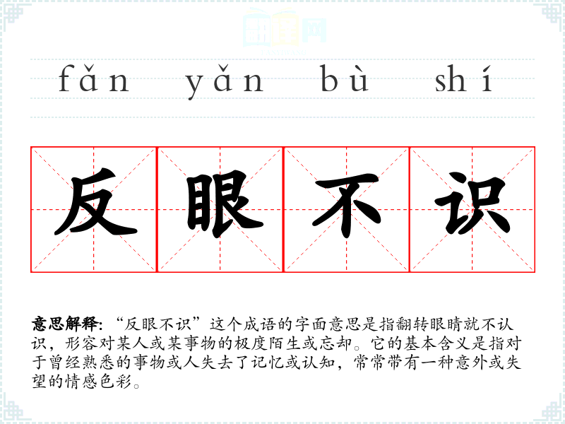 “反眼不识”这个成语的字面意思是指翻转眼睛就不认识,形容对某人或某事物的极度陌生或忘却。它的基本含义是指对于曾经熟悉的事物或人失去了记忆或认知,常常带有一种意外或失望的情感色彩。