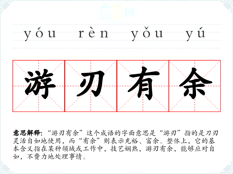 “游刃有余”这个成语的字面意思是“游刃”指的是刀刃灵活自如地使用,而“有余”则表示充裕、富余。整体上,它的基本含义指在某种领域或工作中,技艺娴熟,游刃有余,能够应对自如,不费力地处理事情。