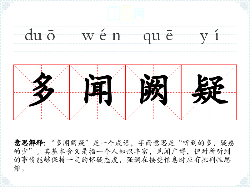 “多闻阙疑”是一个成语,字面意思是“听到的多,疑惑的少”。其基本含义是指一个人知识丰富,见闻广博,但对所听到的事情能够保持一定的怀疑态度,强调在接受信息时应有批判性思维。