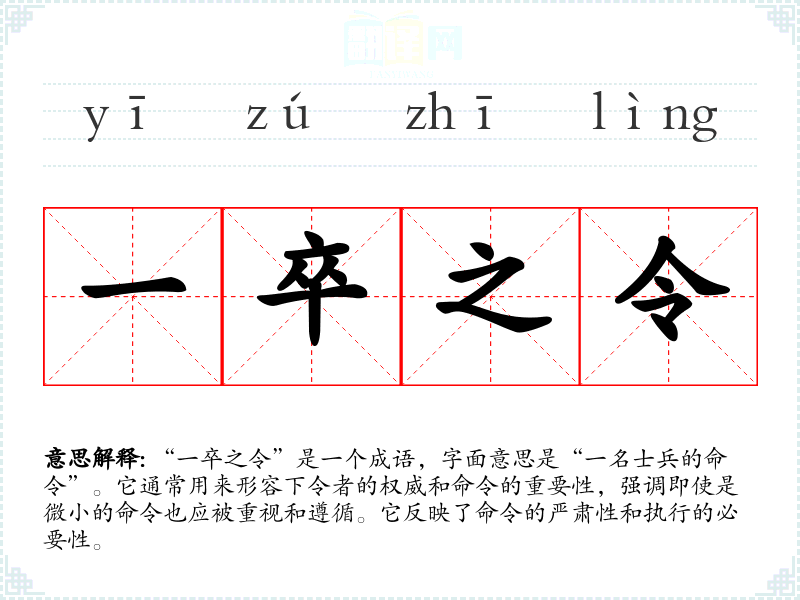 “一卒之令”是一个成语,字面意思是“一名士兵的命令”。它通常用来形容下令者的权威和命令的重要性,强调即使是微小的命令也应被重视和遵循。它反映了命令的严肃性和执行的必要性。
