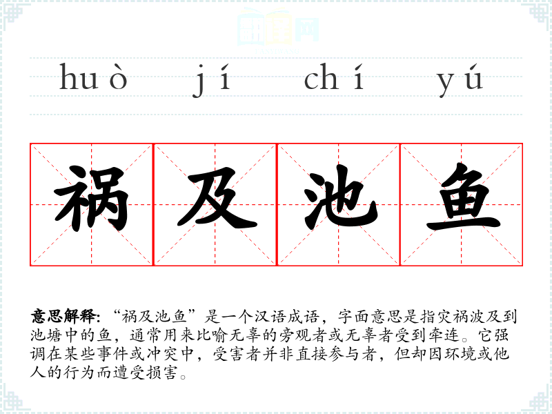 “祸及池鱼”是一个汉语成语,字面意思是指灾祸波及到池塘中的鱼,通常用来比喻无辜的旁观者或无辜者受到牵连。它强调在某些**或冲突中,受害者并非直接参与者,但却因环境或他人的行为而遭受损害。