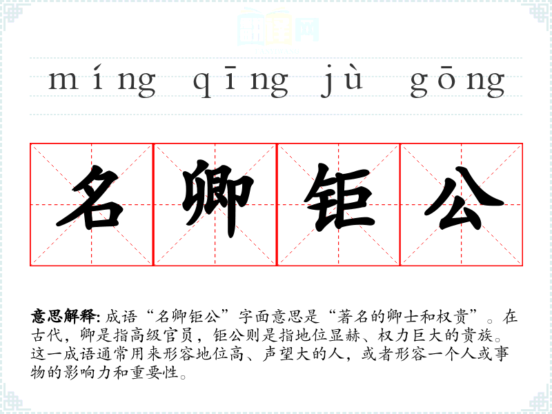 成语“名卿钜公”字面意思是“著名的卿士和权贵”。在古代,卿是指高级官员,钜公则是指地位显赫、权力巨大的贵族。这一成语通常用来形容地位高、声望大的人,或者形容一个人或事物的影响力和重要性。