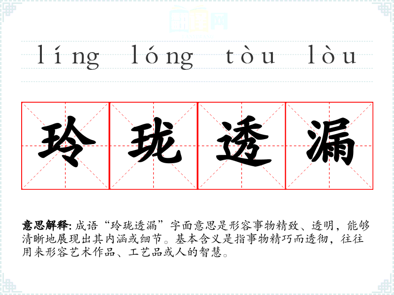 成语“玲珑透漏”字面意思是形容事物精致、透明,能够清晰地展现出其内涵或细节。基本含义是指事物精巧而透彻,往往用来形容艺术作品、工艺品或人的智慧。