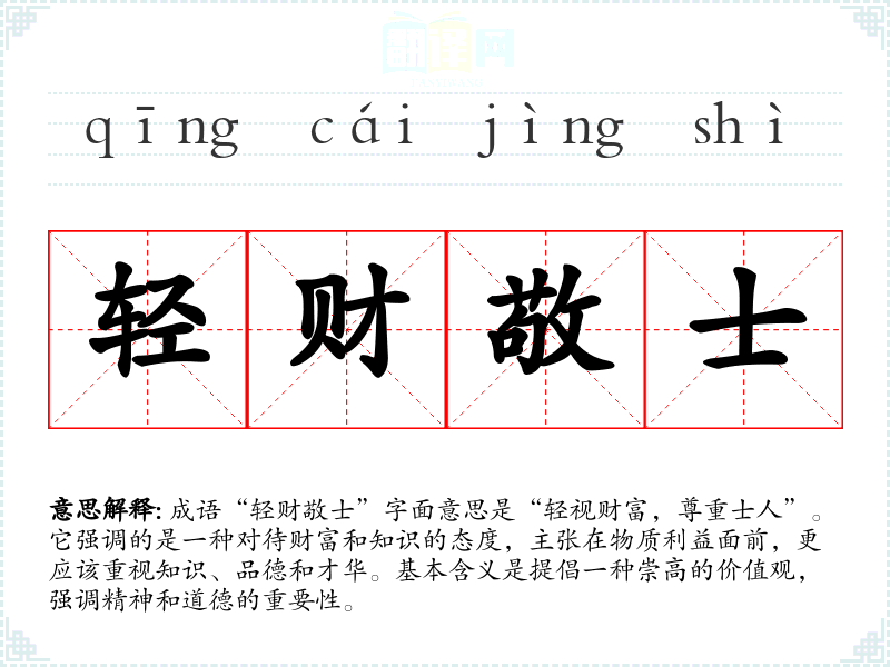 成语“轻财敬士”字面意思是“轻视财富,尊重士人”。它强调的是一种对待财富和知识的态度,主张在物质利益面前,更应该重视知识、品德和才华。基本含义是提倡一种崇高的价值观,强调精神和道德的重要性。