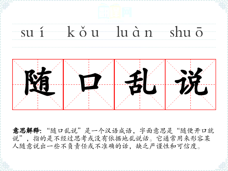 “随口乱说”是一个汉语成语,字面意思是“随便开口就说”,指的是不经过思考或没有依据地乱说话。它通常用来形容某人随意说出一些不负责任或不准确的话,缺乏严谨性和可信度。