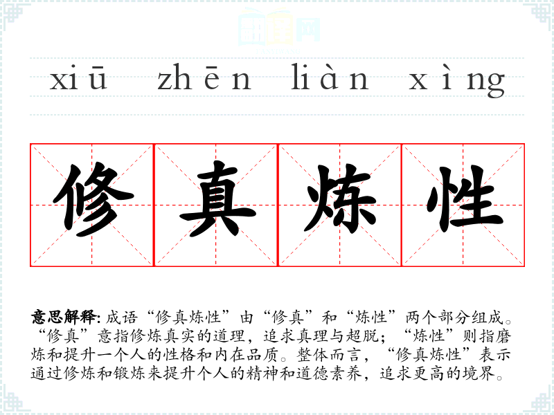 成语“修真炼性”由“修真”和“炼性”两个部分组成。“修真”意指修炼真实的道理,追求真理与超脱;“炼性”则指磨炼和提升一个人的性格和内在品质。整体而言,“修真炼性”表示通过修炼和锻炼来提升个人的精神和道德素养,追求更高的境界。