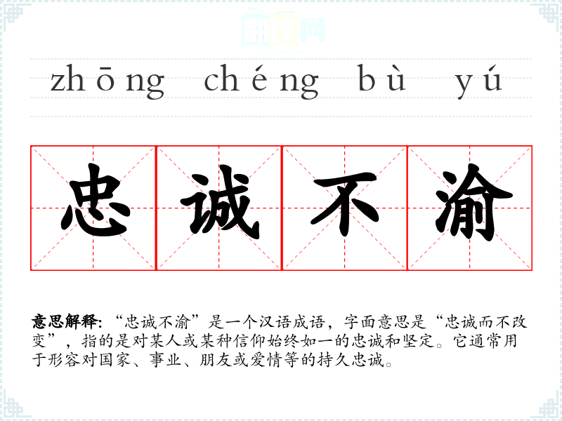 “忠诚不渝”是一个汉语成语,字面意思是“忠诚而不改变”,指的是对某人或某种信仰始终如一的忠诚和坚定。它通常用于形容对国家、事业、朋友或爱情等的持久忠诚。