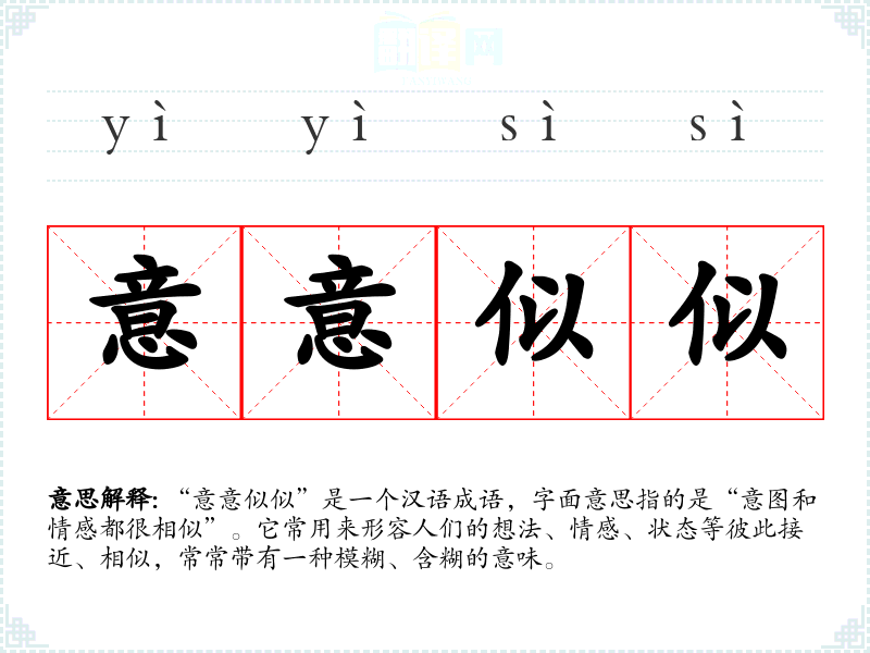 “意意似似”是一个汉语成语,字面意思指的是“意图和情感都很相似”。它常用来形容人们的想法、情感、状态等彼此接近、相似,常常带有一种模糊、含糊的意味。