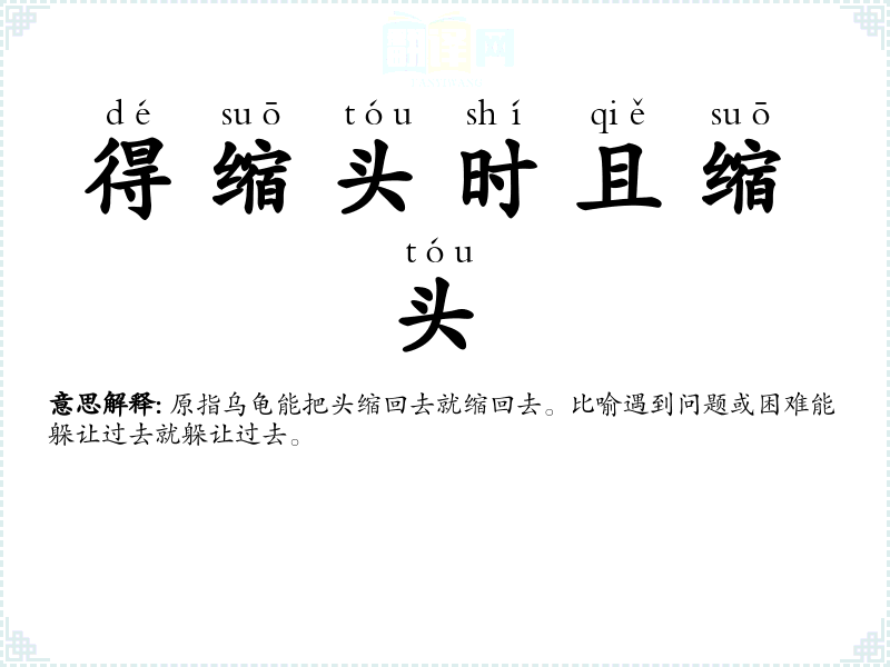 | 得缩头时且缩头 | 原指乌龟能把头缩回去就缩回去。比喻遇到问题或困难能躲让过去就躲让过去。 |