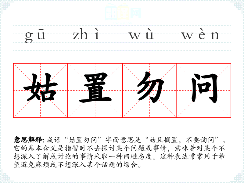 成语“姑置勿问”字面意思是“姑且搁置,不要询问”。它的基本含义是指暂时不去探讨某个问题或事情,意味着对某个不想深入了解或讨论的事情采取一种回避态度。这种表达常常用于希望避免麻烦或不想深入某个话题的场合。