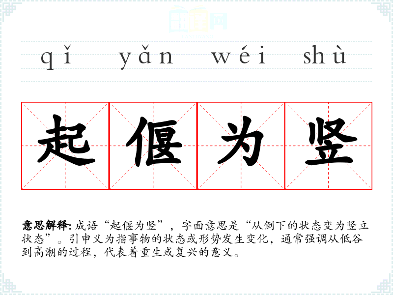 成语“起偃为竖”,字面意思是“从倒下的状态变为竖立状态”。引申义为指事物的状态或形势发生变化,通常强调从低谷到高潮的过程,代表着重生或复兴的意义。