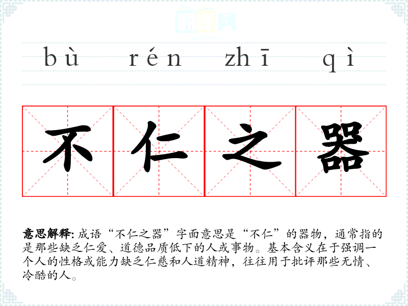 成语“不仁之器”字面意思是“不仁”的器物,通常指的是那些缺乏仁爱、道德品质低下的人或事物。基本含义在于强调一个人的性格或能力缺乏仁慈和人道精神,往往用于批评那些无情、冷酷的人。