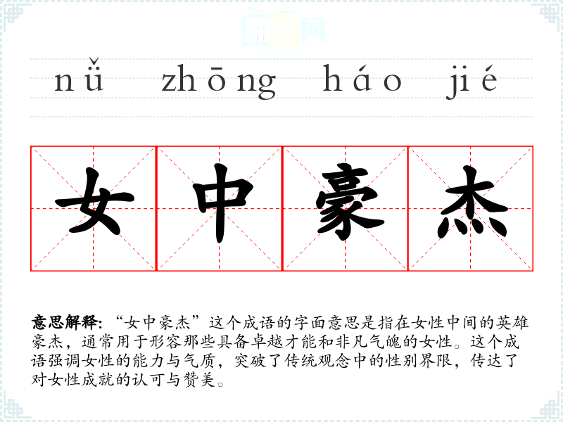 “女中豪杰”这个成语的字面意思是指在女性中间的英雄豪杰,通常用于形容那些具备卓越才能和非凡气魄的女性。这个成语强调女性的能力与气质,突破了传统观念中的性别界限,传达了对女性成就的认可与赞美。