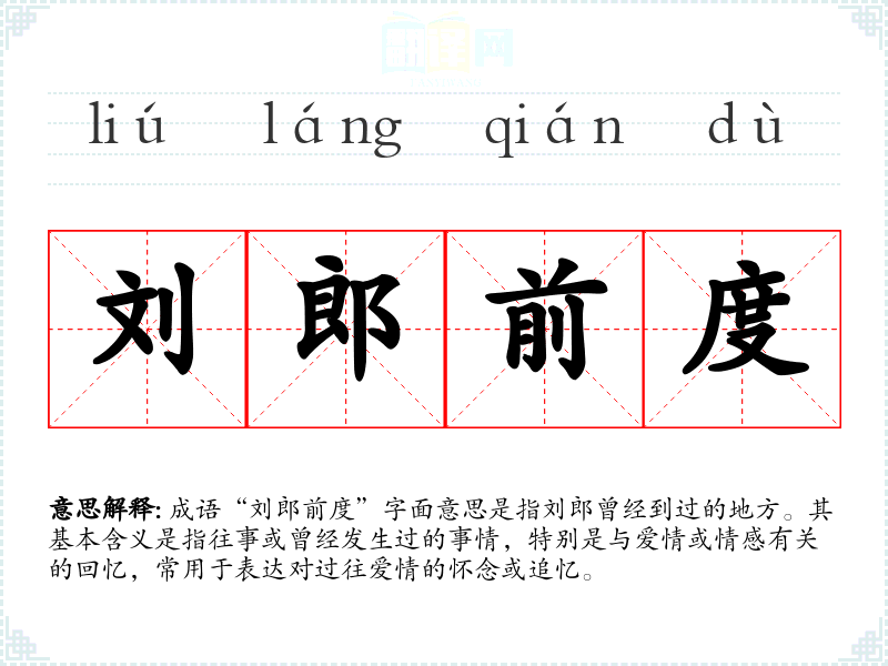 成语“刘郎前度”字面意思是指刘郎曾经到过的地方。其基本含义是指往事或曾经发生过的事情,特别是与爱情或情感有关的回忆,常用于表达对过往爱情的怀念或追忆。