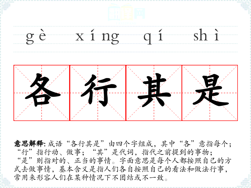 成语“各行其是”由四个字组成,其中“各”意指每个;“行”指行动、做事;“其”是代词,指代之前提到的事物;“是”则指对的、正当的事情。字面意思是每个人都按照自己的方式去做事情,基本含义是指人们各自按照自己的看法和做法行事,常用来形容人们在某种情况下不团结或不一致。