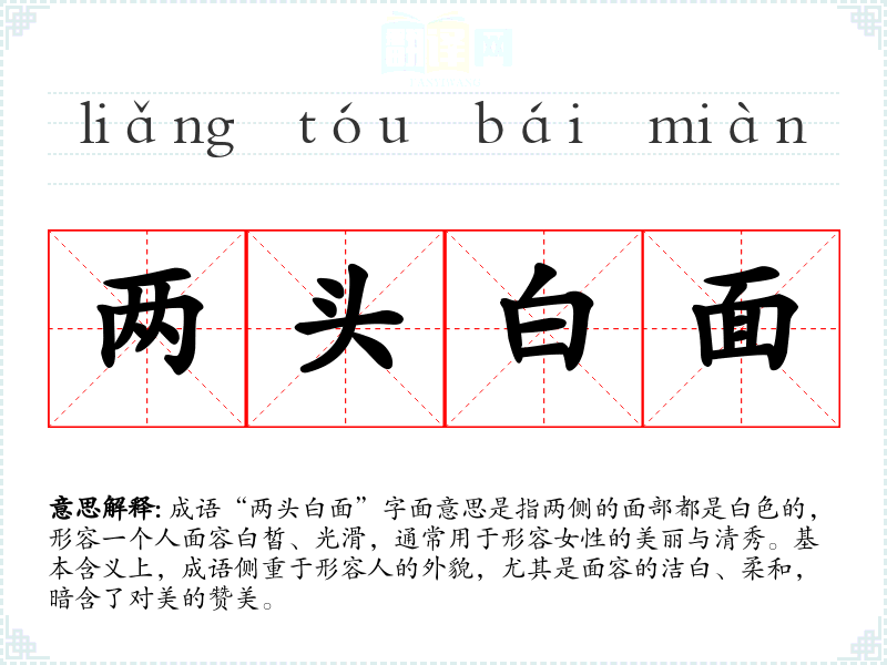 成语“两头白面”字面意思是指两侧的面部都是白色的,形容一个人面容白皙、光滑,通常用于形容女性的美丽与清秀。基本含义上,成语侧重于形容人的外貌,尤其是面容的洁白、柔和,暗含了对美的赞美。
