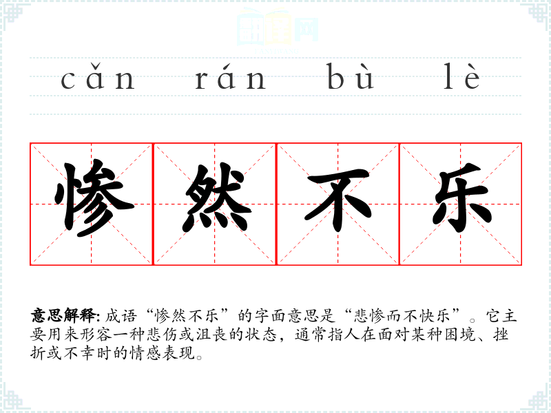 成语“惨然不乐”的字面意思是“悲惨而不快乐”。它主要用来形容一种悲伤或沮丧的状态,通常指人在面对某种困境、挫折或不幸时的情感表现。