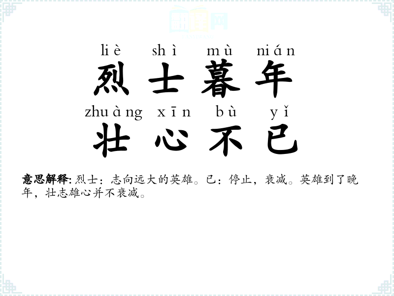 烈士:志向远大的英雄。已:停止,衰减。英雄到了晚年,壮志雄心并不衰减。 |