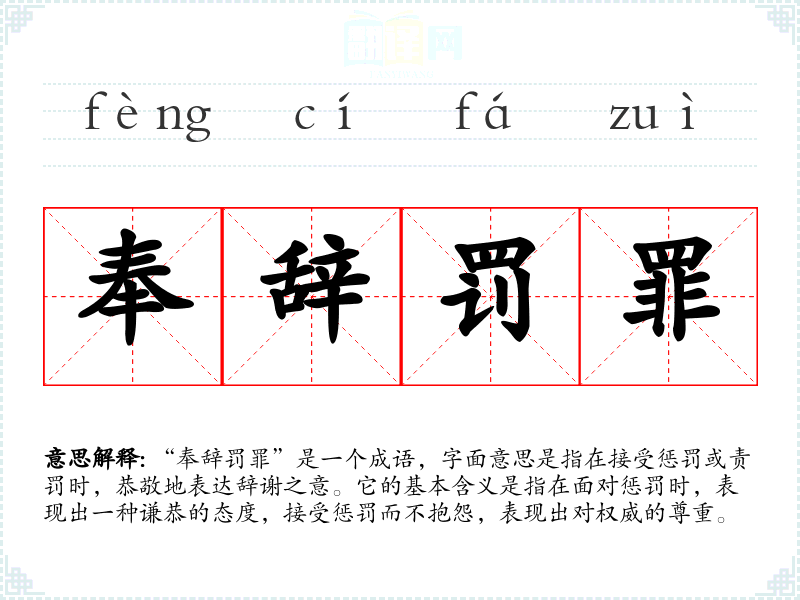 “奉辞罚罪”是一个成语,字面意思是指在接受惩罚或责罚时,恭敬地表达辞谢之意。它的基本含义是指在面对惩罚时,表现出一种谦恭的态度,接受惩罚而不抱怨,表现出对权威的尊重。