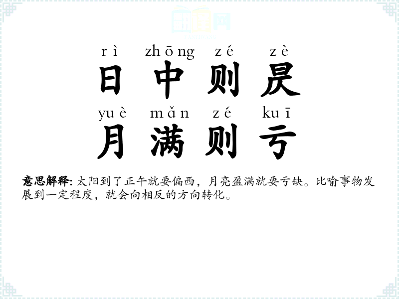 昃:太阳偏西。太阳到了正午就要西斜,月亮满圆就要亏缺。比喻事物盛极必衰,或发展到一定限度就会向相反方向转化。 |