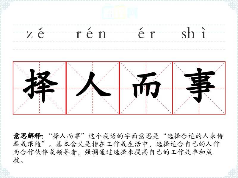 “择人而事”这个成语的字面意思是“选择合适的人来侍奉或跟随”。基本含义是指在工作或生活中,选择适合自己的人作为合作伙伴或领导者,强调通过选择来提高自己的工作效率和成就。