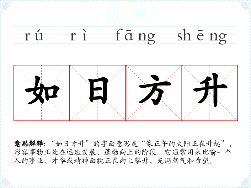 “如日方升”的字面意思是“像正午的太阳正在升起”,形容事物正处在迅速发展、蓬勃向上的阶段。它通常用来比喻一个人的事业、才华或精神面貌正在向上攀升,充满朝气和希望。