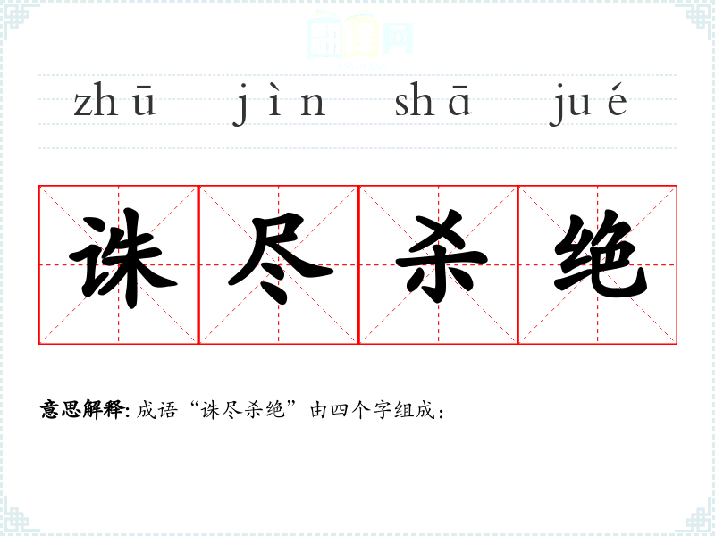 | 诛尽杀绝 | 诛;斩。杀得一个不留。 |