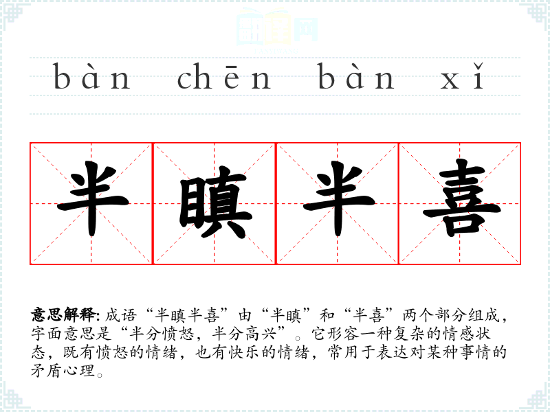 成语“半瞋半喜”由“半瞋”和“半喜”两个部分组成,字面意思是“半分愤怒,半分高兴”。它形容一种复杂的情感状态,既有愤怒的情绪,也有快乐的情绪,常用于表达对某种事情的矛盾心理。