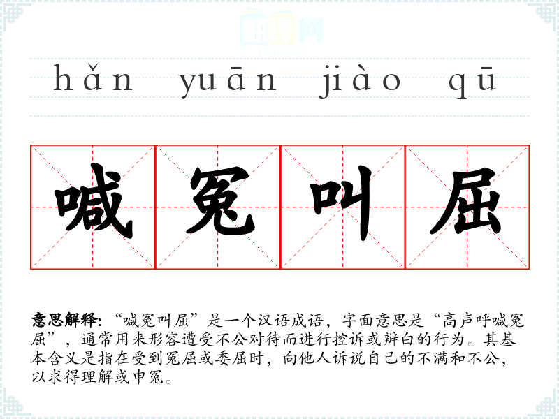 “喊冤叫屈”是一个汉语成语,字面意思是“高声呼喊冤屈”,通常用来形容遭受不公对待而进行控诉或辩白的行为。其基本含义是指在受到冤屈或委屈时,向他人诉说自己的不满和不公,以求得理解或申冤。