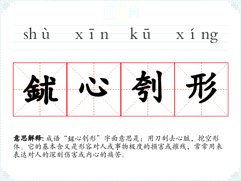 成语“鉥心刳形”字面意思是:用刀刮去心脏,挖空形体。它的基本含义是形容对人或事物极度的损害或摧残,常常用来表达对人的深刻伤害或内心的痛苦。