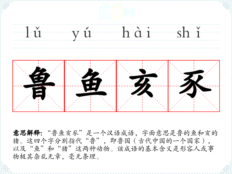 “鲁鱼亥豕”是一个汉语成语,字面意思是鲁的鱼和亥的猪。这四个字分别指代“鲁”,即鲁国(古代**的一个国家),以及“鱼”和“猪”这两种动物。该成语的基本含义是形容人或事物极其杂乱无章,毫无条理。