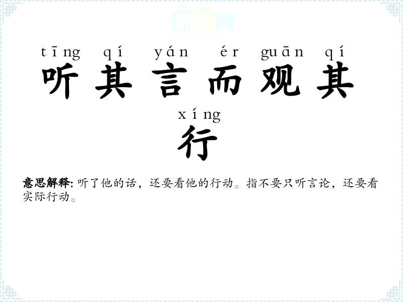 听了他的话,还要看他的行动。指不要只听言论,还要看实际行动。 |