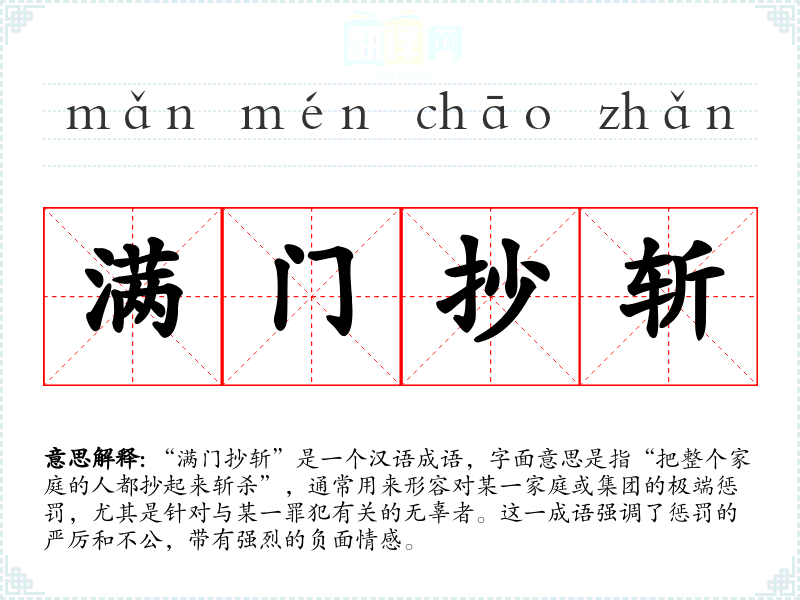 “满门抄斩”是一个汉语成语,字面意思是指“把整个家庭的人都抄起来斩杀”,通常用来形容对某一家庭或集团的极端惩罚,尤其是针对与某一罪犯有关的无辜者。这一成语强调了惩罚的严厉和不公,带有强烈的负面情感。