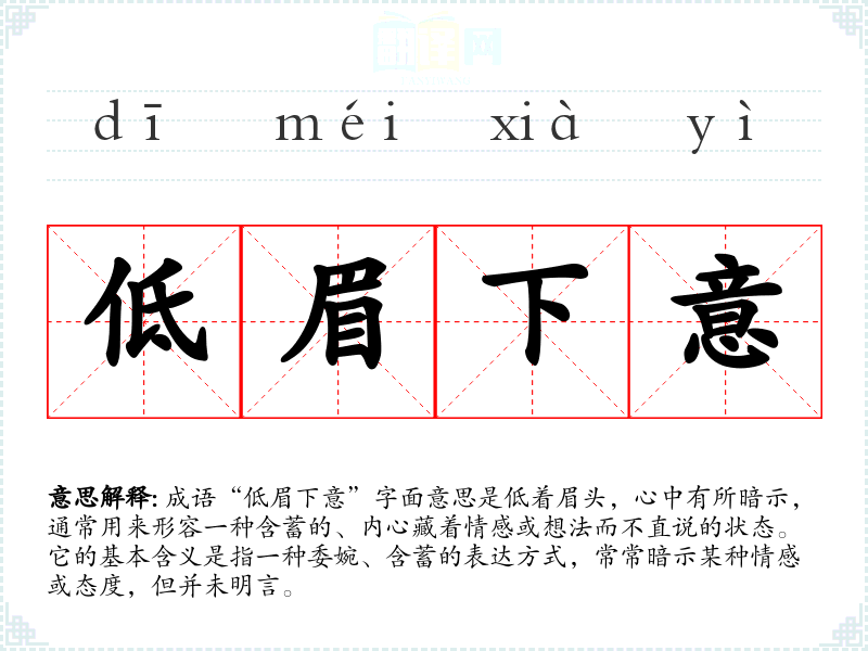 成语“低眉下意”字面意思是低着眉头,心中有所暗示,通常用来形容一种含蓄的、内心藏着情感或想法而不直说的状态。它的基本含义是指一种委婉、含蓄的表达方式,常常暗示某种情感或态度,但并未明言。