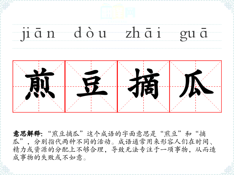 “煎豆摘瓜”这个成语的字面意思是“煎豆”和“摘瓜”,分别指代两种不同的活动。成语通常用来形容人们在时间、精力或资源的分配上不够合理,导致无法专注于一项事物,从而造成事物的失败或不如意。