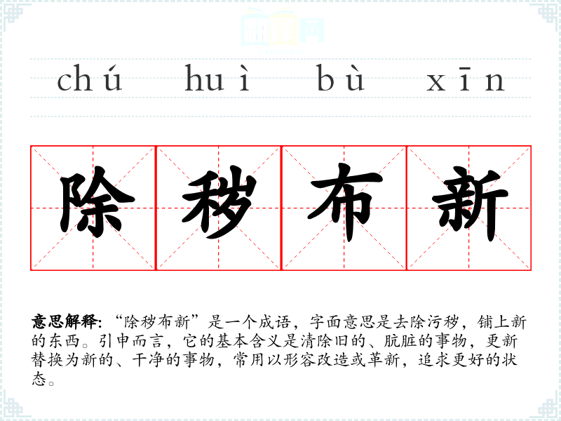 在英语中,类似于“除秽布新”的表达可以是“clean slate”,意指重新开始,去除过去的负担。虽然两者侧重点不同,但都强调了更新和清理的重要性。